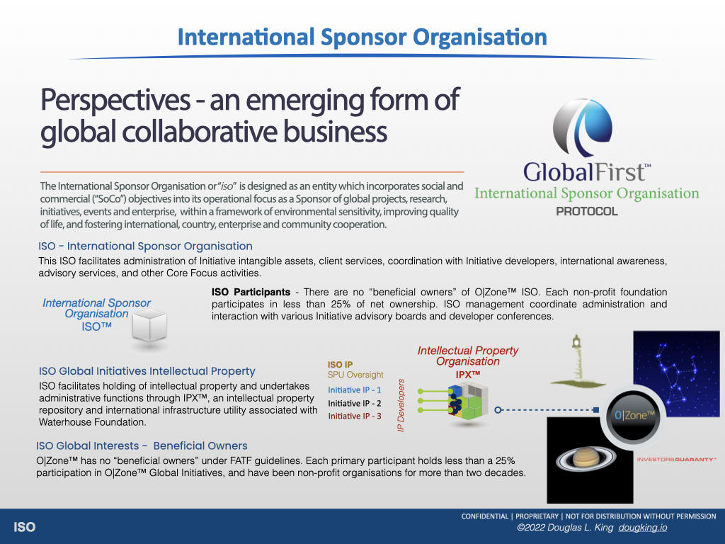 An ISO for establishing a traditional ("HOMEWORLD") legal entity to facilitate HGVS Ecosystem's geographic and jurisdictional activities. Five non-profit charitable | educational foundations sponsor formation of HGVS ISO in a manner which provides a statutorily protected portfolio infrastructure to facilitate an array of organisational and administrative capabilities, somewhat similar to an "association". A primary role is to act as "Sponsor" of various infrastructure Components which enable functionalities within HGVS Ecosystem, consistent with principles of Alliance iii.o Protocol.